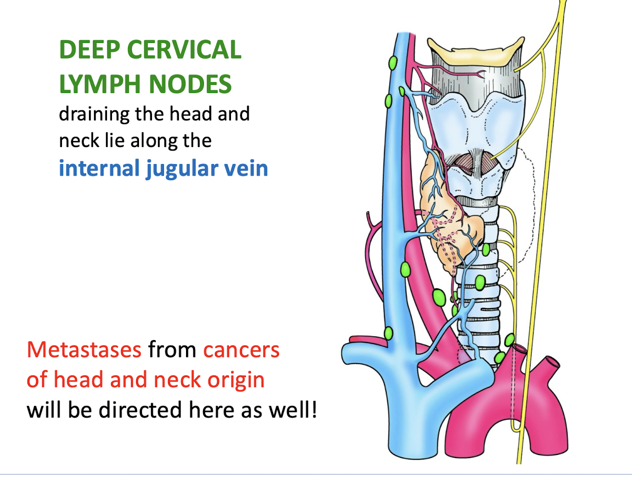 Meaning If there’s a cancer in the head or neck, it often spreads (metastasizes) to these nodes first.