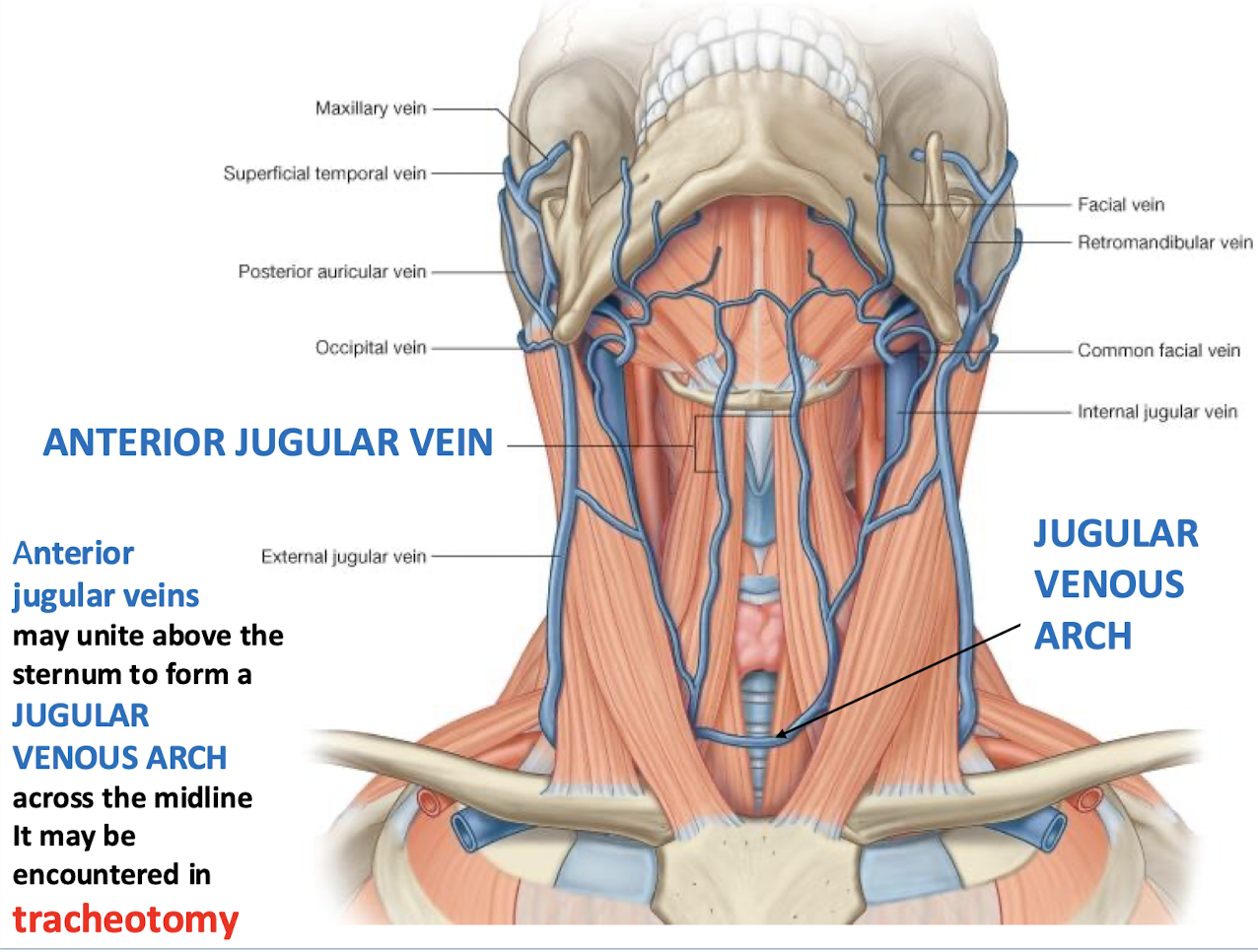 The AJV may unite above the sternum to form a JUGULAR VENOUS ARCH across the midline which may be encountered in tracheotomy