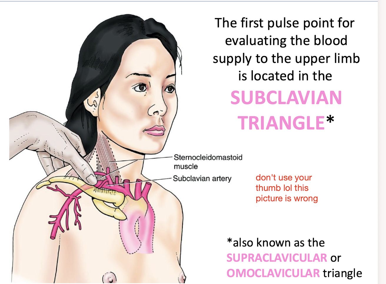 Where is the first pulse point for evaluating the blood supply to the upper limb located?