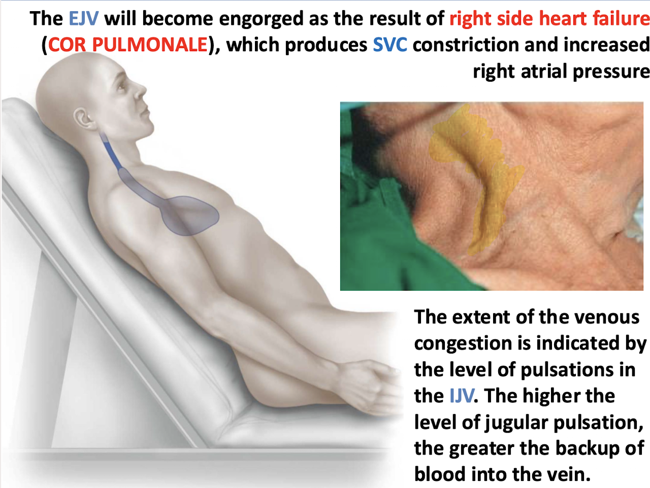 Right-sided heart failure (cor pulmonale) → ↑ right atrial pressure → blood backs up into SVC (superior vena cava constriction) and EJV becomes engorged.