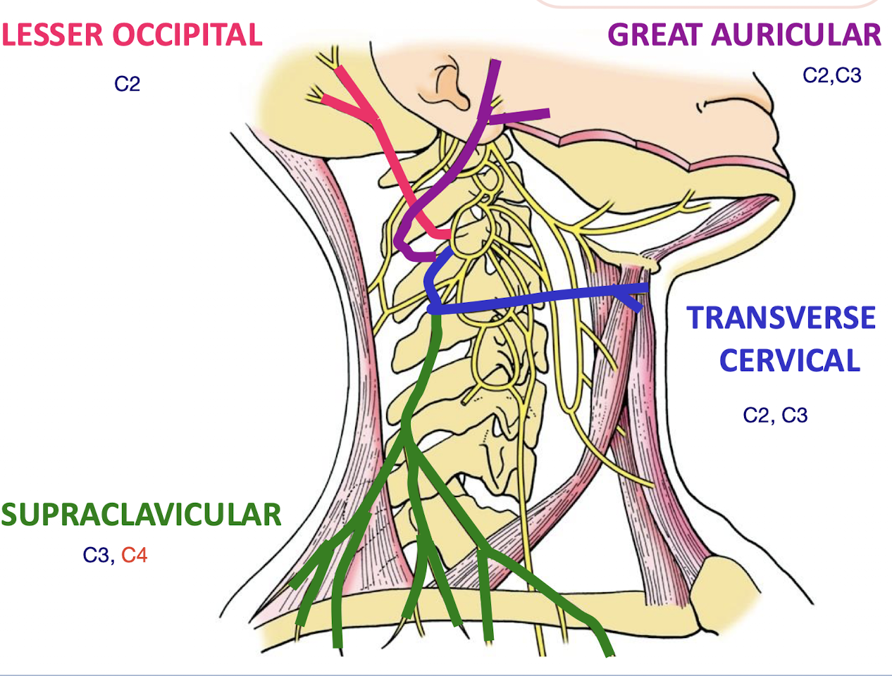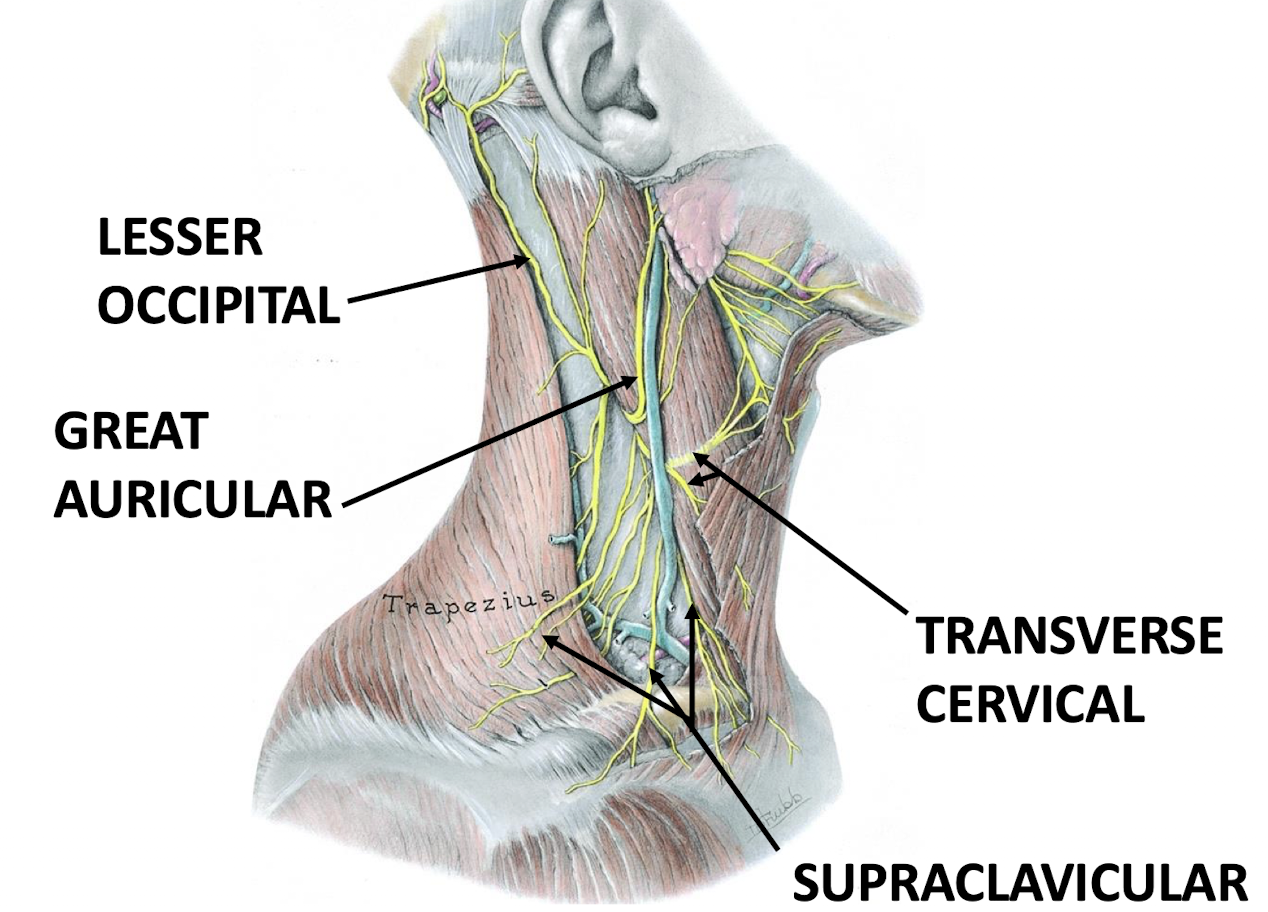 TRANSVERSE CERVICAL; GREAT AURICULAR; LESSER OCCIPITAL; SUPRACLAVICULAR