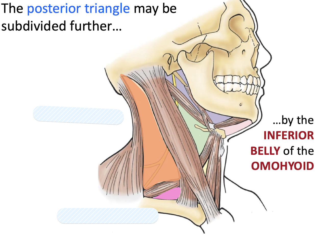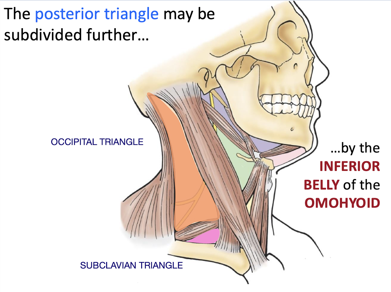 The INFERIOR BELLY of the OMOHYOID subdivides into the Occipital and Subclavian Triangles