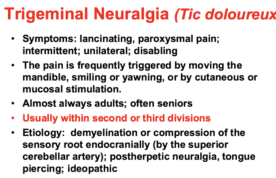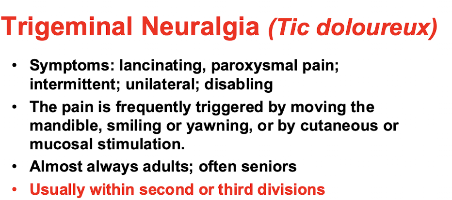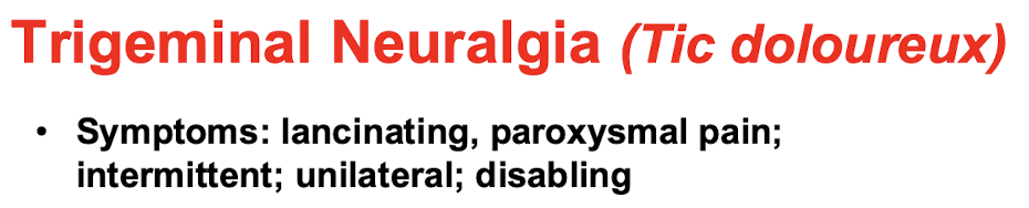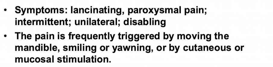 Lancinating (sharp stabbing pain) ; paroxysmal pain (sudden bursts of intense pain that goes quickly); intermittent; unilateral (one side of the face); disabling PAIN