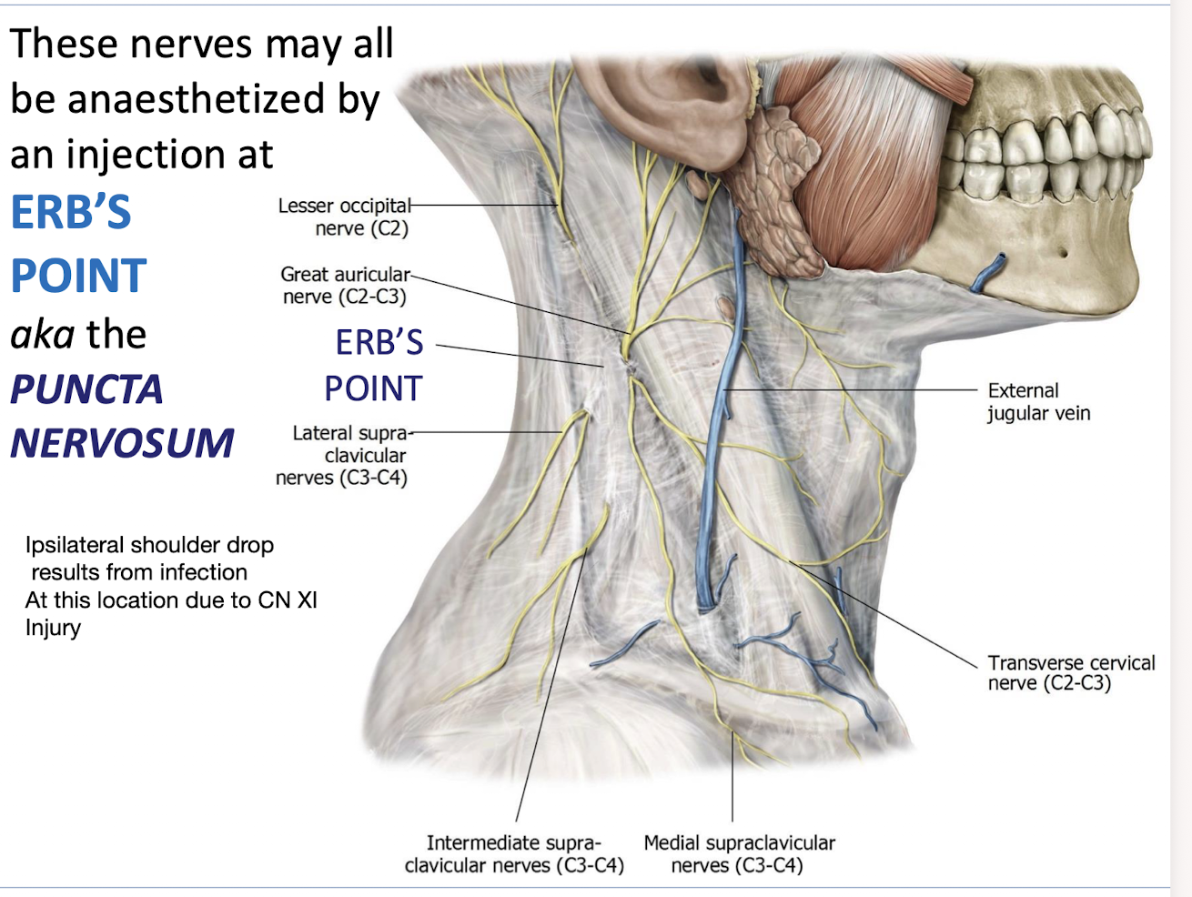 These cutaneous nerves (from the cervical plexus) may all be anesthetized by an injection at this location