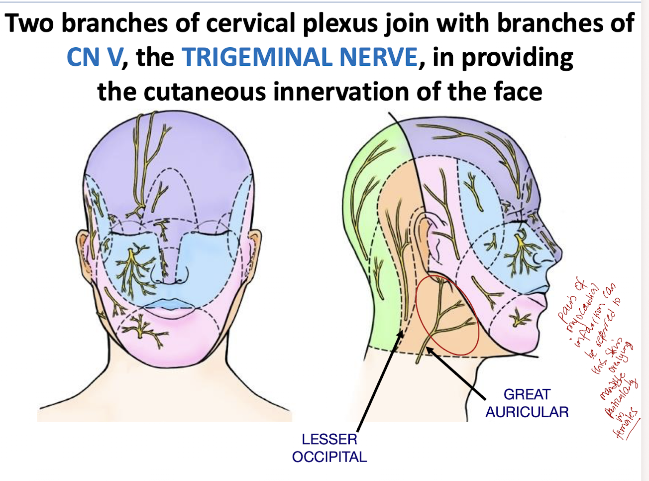 What two branches of the cervical plexus join with branches of the trigeminal nerve to provide cutaneous innervation of the face?