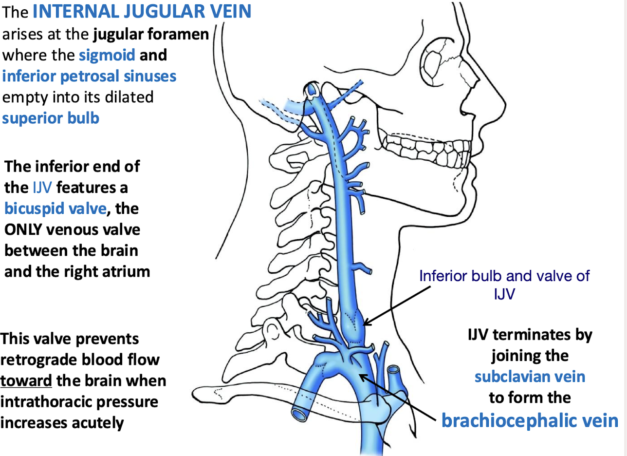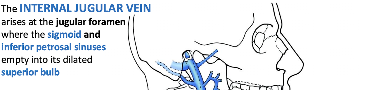 Where does the INTERNAL JUGULAR VEIN (IJV) arise? What empties into it?
