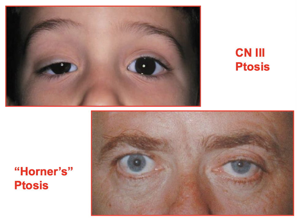 A lesion of either the sympathetic innervation (“Horner’s” Ptosis) OR CN III (“CN III Ptosis”)