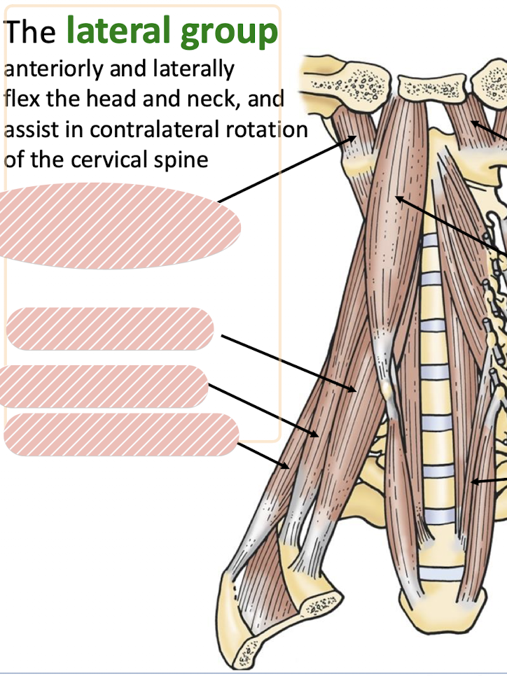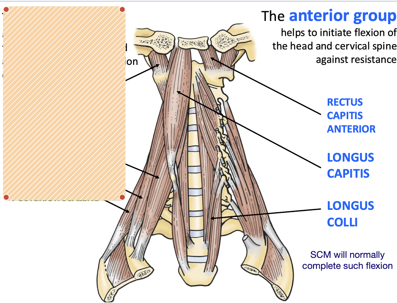 The anterior group helps to initiate flexion of the head and cervical spine against resistance. (The SCM helps to complete the flexion)