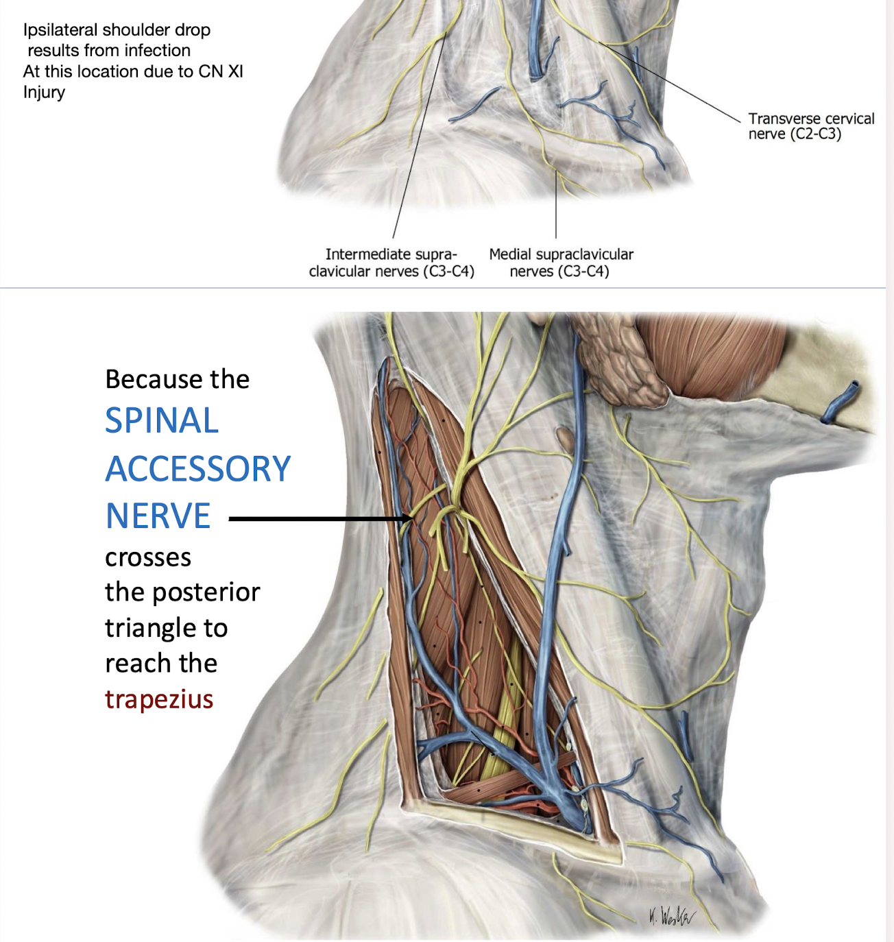 The SPINAL ACCESSORY NERVE (CN XI); because it crosses the posterior triangle to reach the trapezius