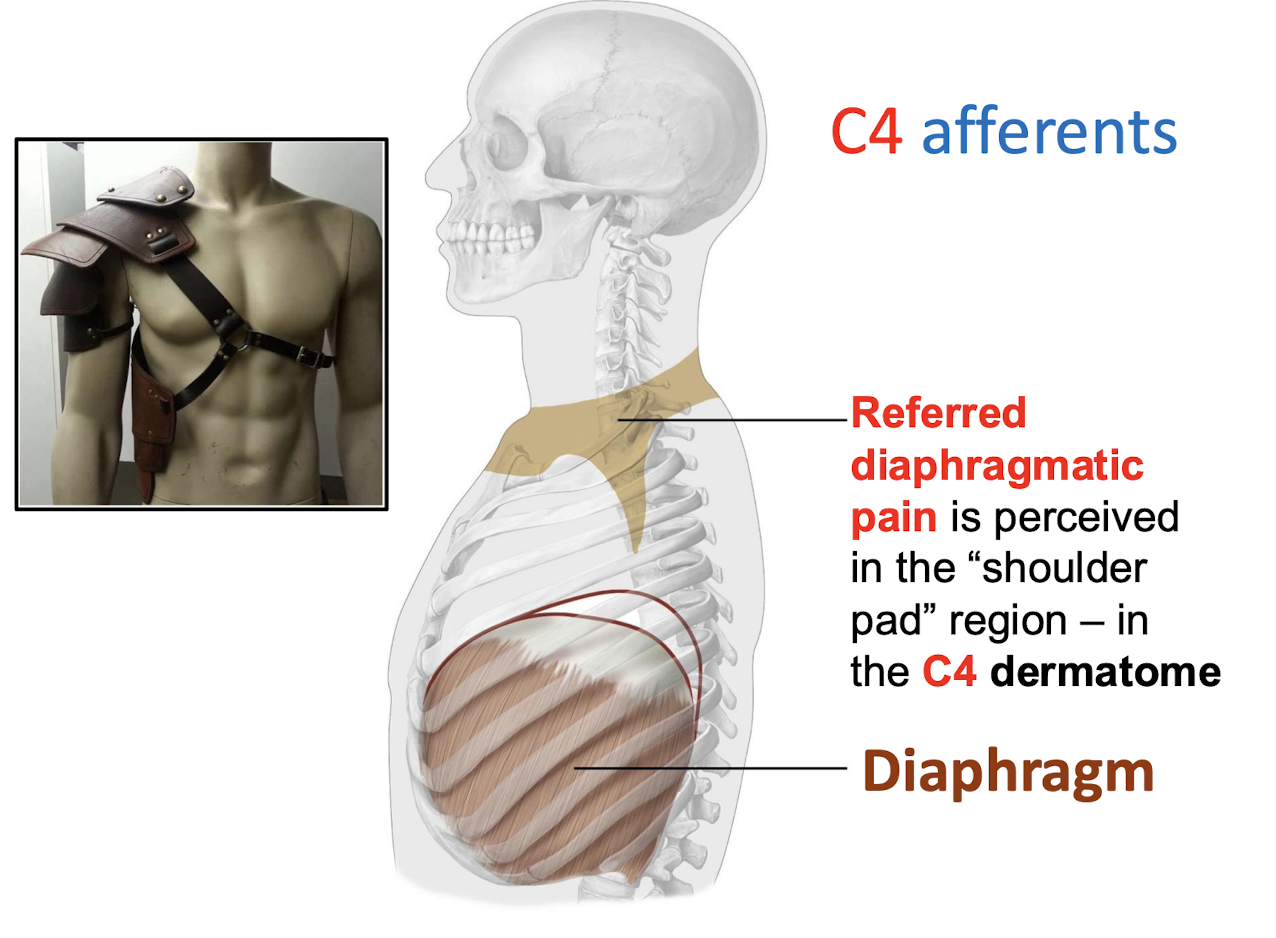 In the “shoulder pad” region; in the C4 dermatome by C4 afferents