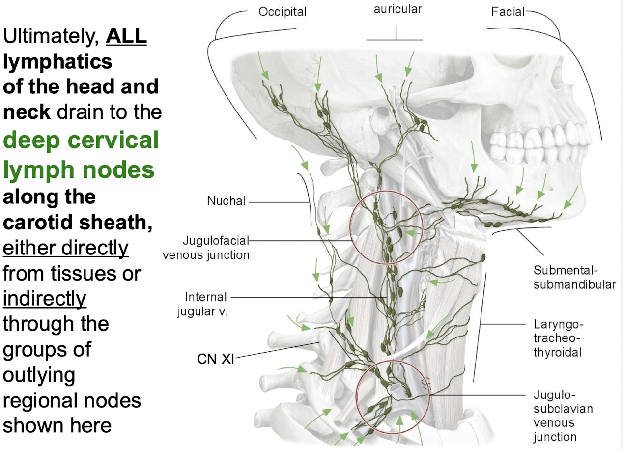 Ultimately ALL lymphatics of the HEAD AND NECK drain to the deep cervical lymph nodes along the carotid sheath.