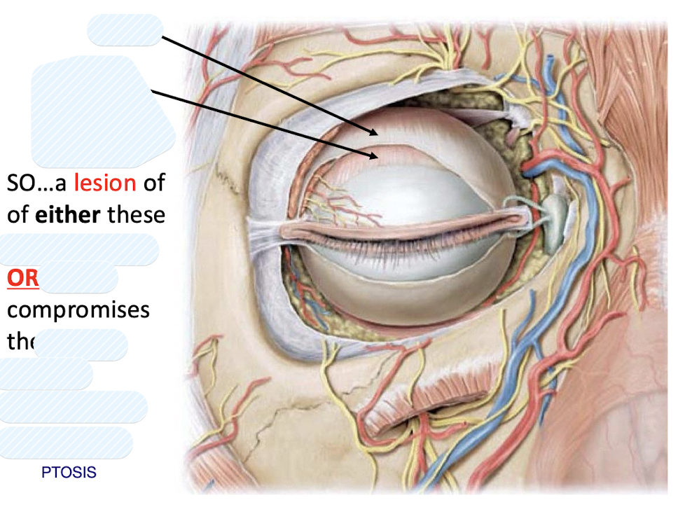 A patient presents with PTOSIS; what two distinct neurological lesions could be the cause?
