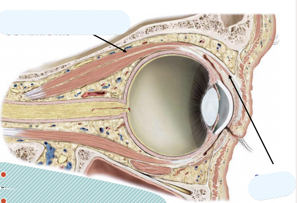 LEVATOR PALPEBRAE SUPERIORIS (skeletal muscle; innervated by CN III OCULOMOTOR runs from the orbital roof to the deep surface of the upper eyelid); and the SUPERIOR TARSAL MUSCLE (SMOOTH muscle; innervated by sympathetics).
