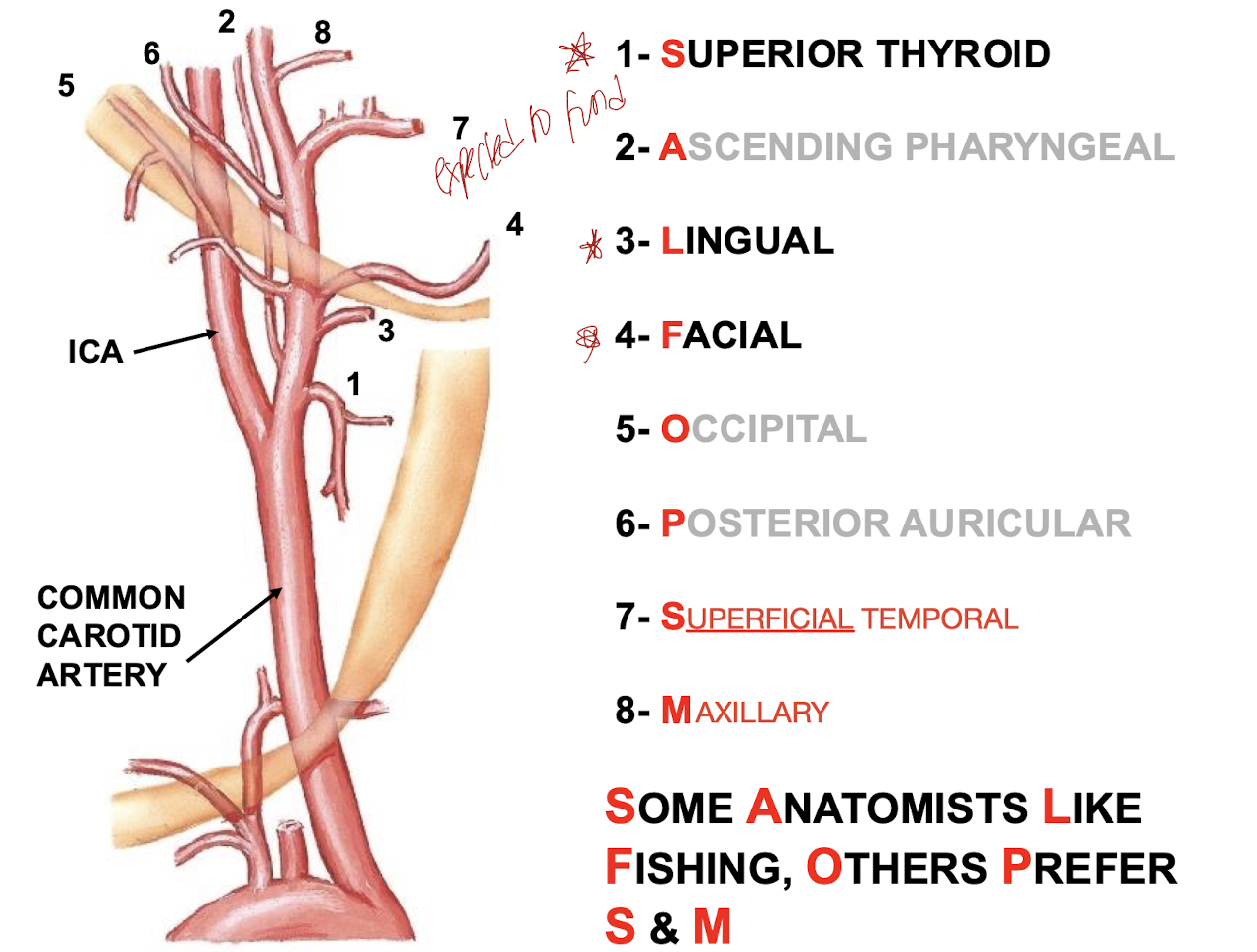 How many branches does the EXTERNAL CAROTID ARTERY have; and what areas do they supply?