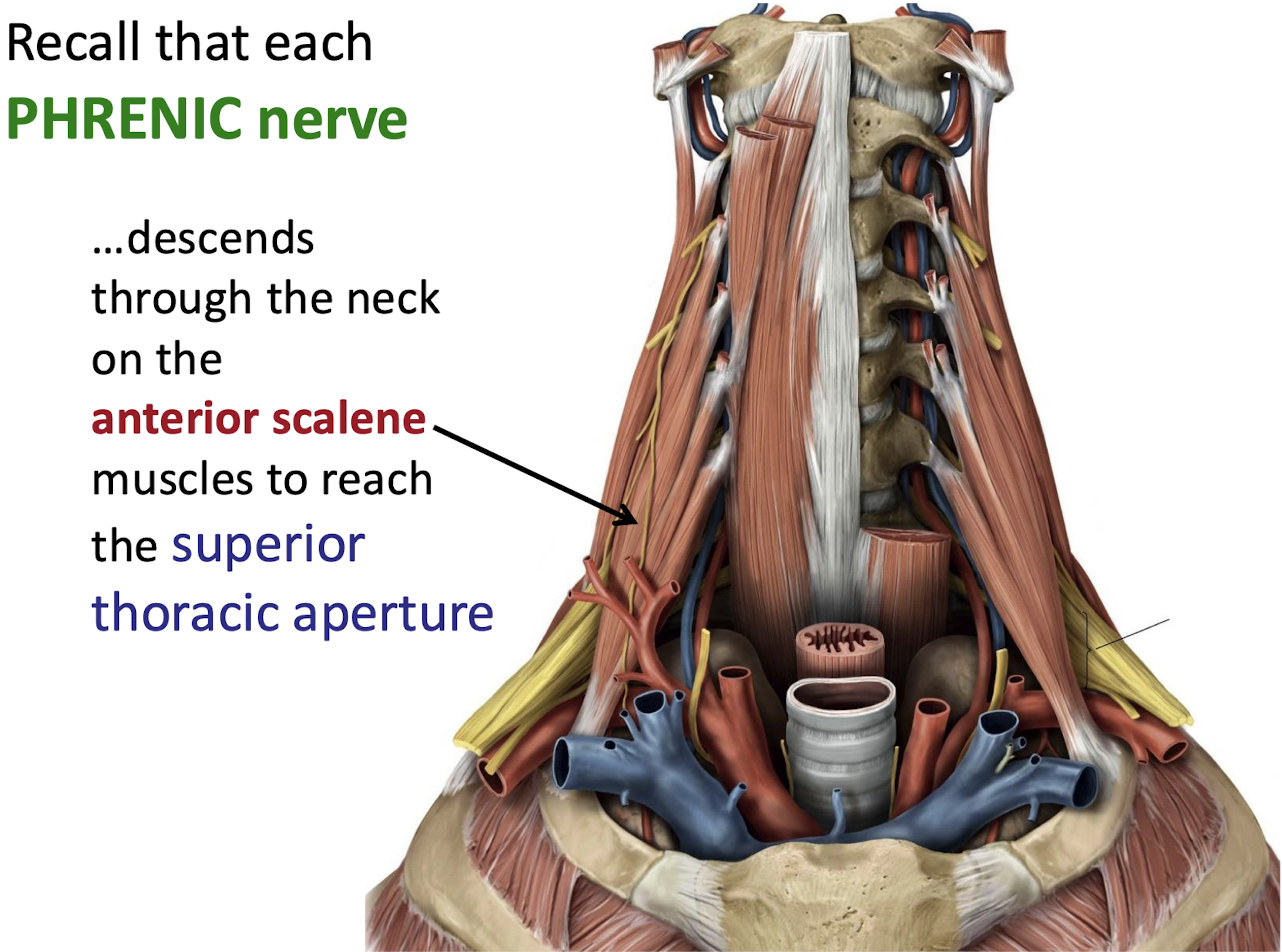 Which major nerve descends through the neck on the anterior scalene muscles to reach the superior thoracic aperture?
