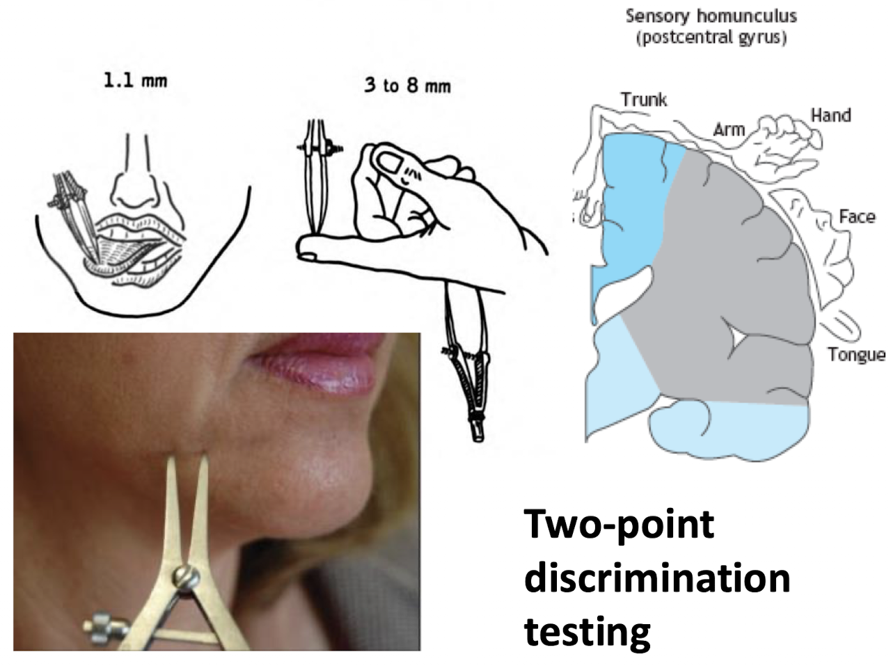 What is two-point discrimination testing and what does it assess? What is the most sensitive area?