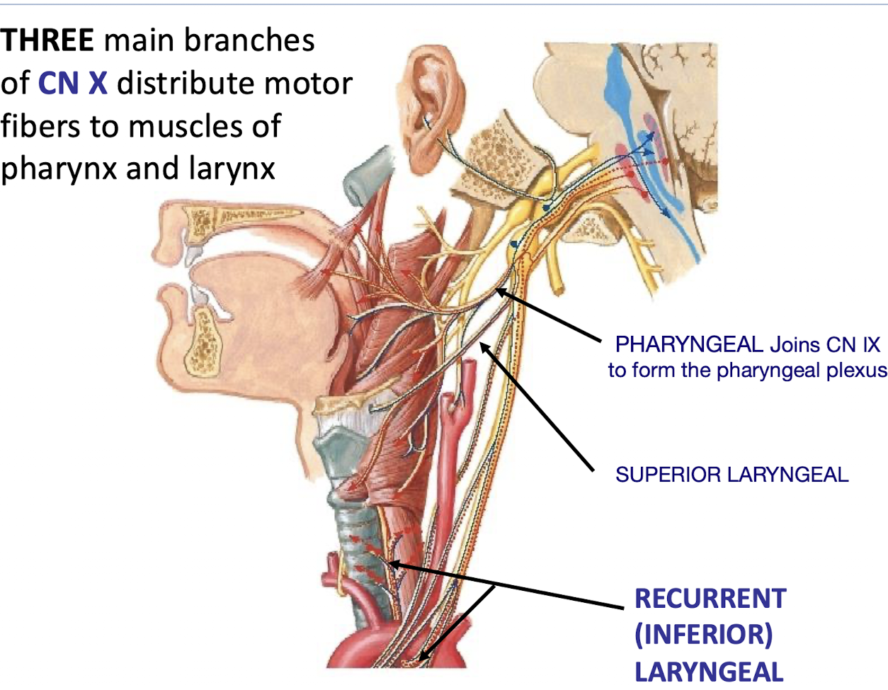 What are the THREE main branches of CN X that distribute motor fibers to muscles of the pharynx and larynx?