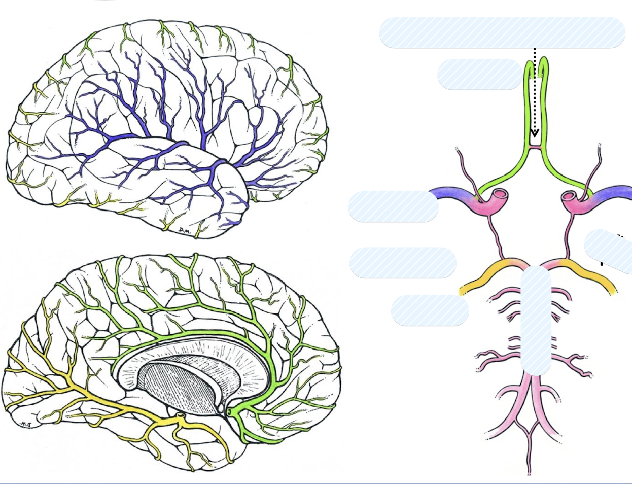 MCA (Middle Cerebral Artery) 🔵 → lateral brain