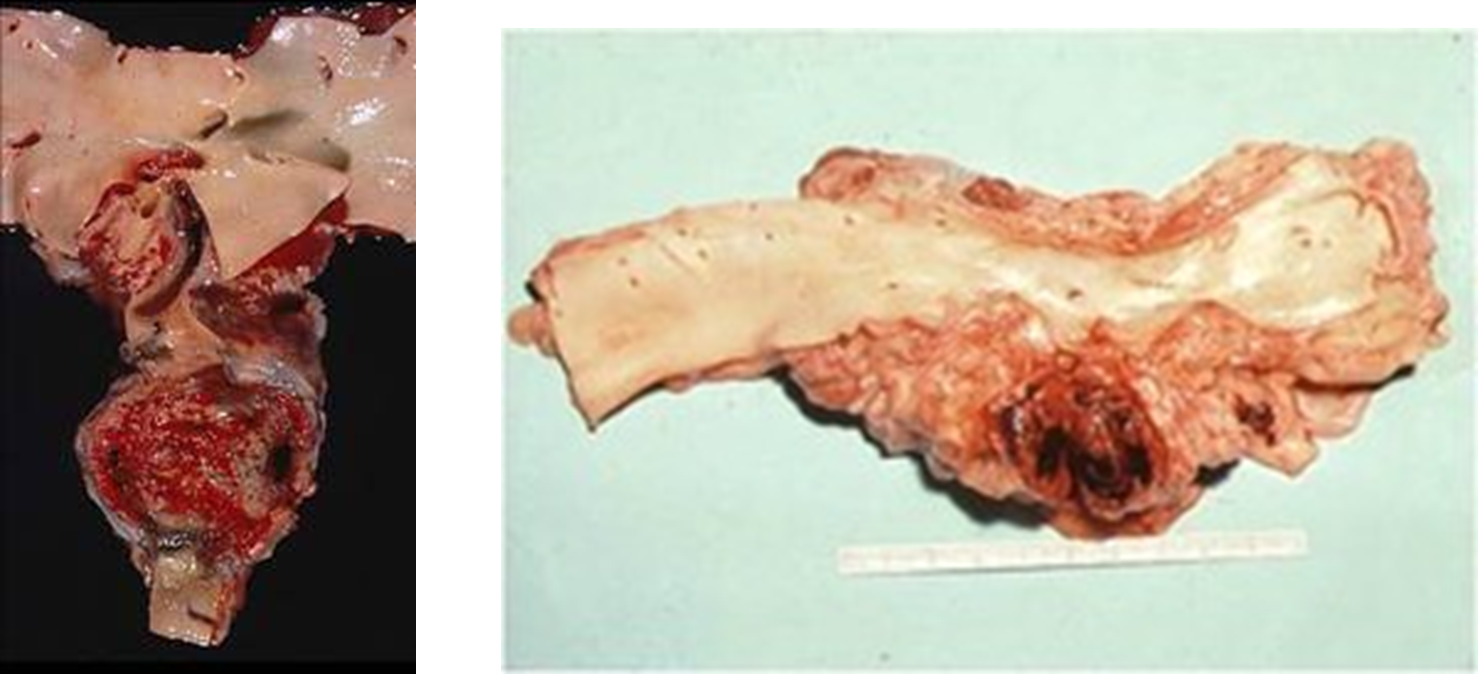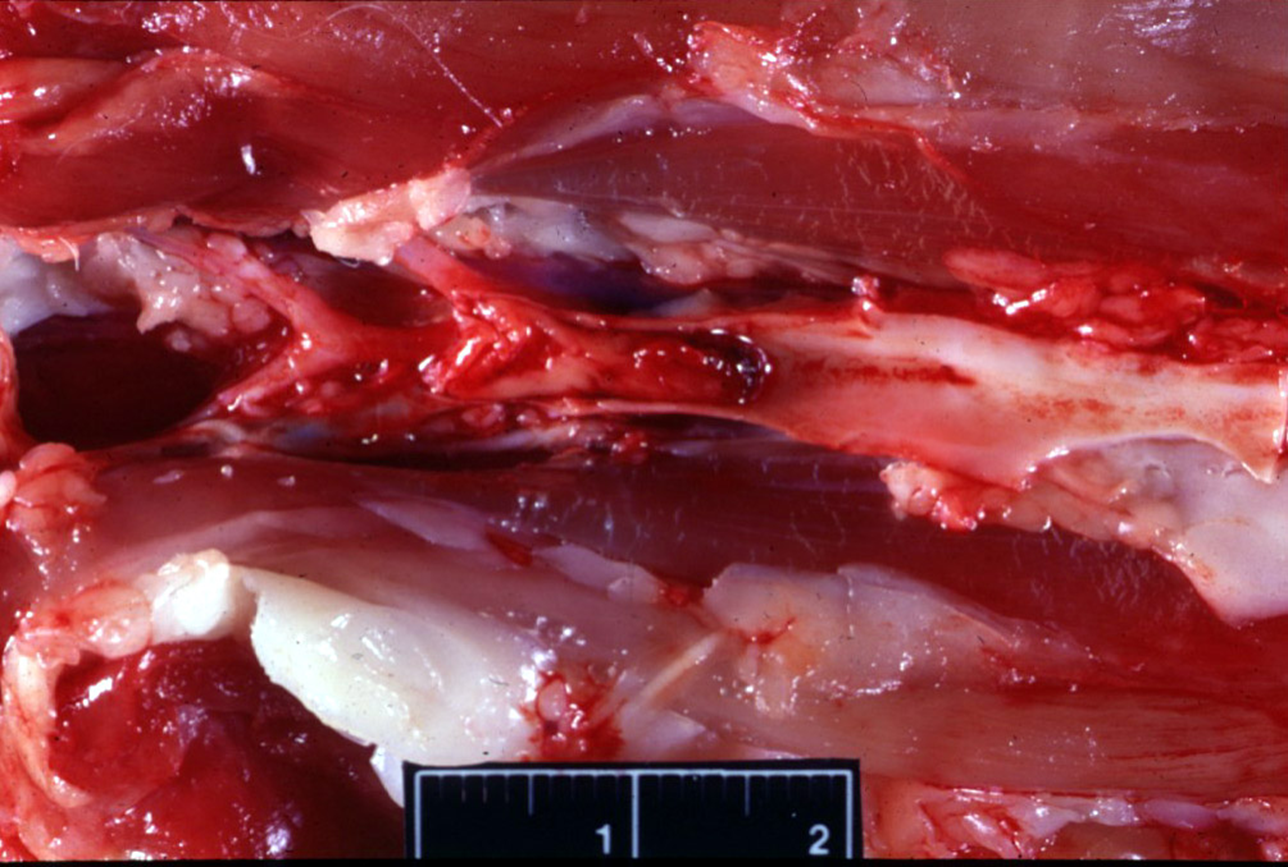 Disecting aneurysms in birds —> disruption of intima → entry of blood into media dissecting along the wall