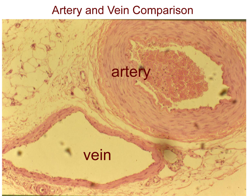Arteries = thick wall, narrow lumen