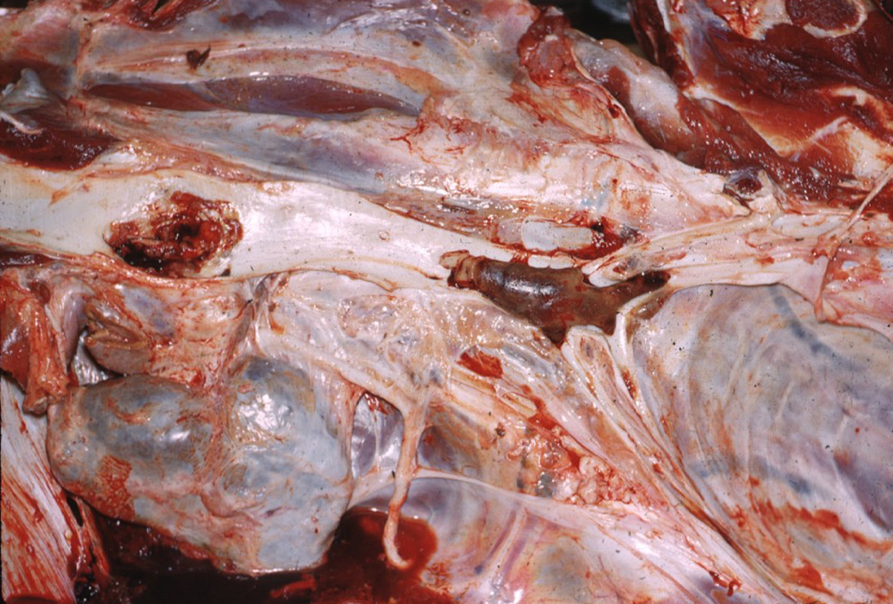 Malignant Catarrhal Fever (MCF) of cattle (gamma-herpesvirus) —> Polyarteritis and periarteritis
