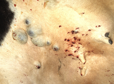 Occurring exclusively in dogs, solitary, multilobulated masses occurring around the joints of limbs. White and firm