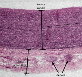 Tunica adventitia —> Collagen, elastic fibres and connective tissue with blood vessels (Vasa vasorum —> vessels that supply large vessels)