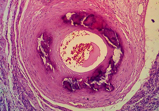 Solid, dense, pipe-like structures with raised, solid, white, intimal plaques