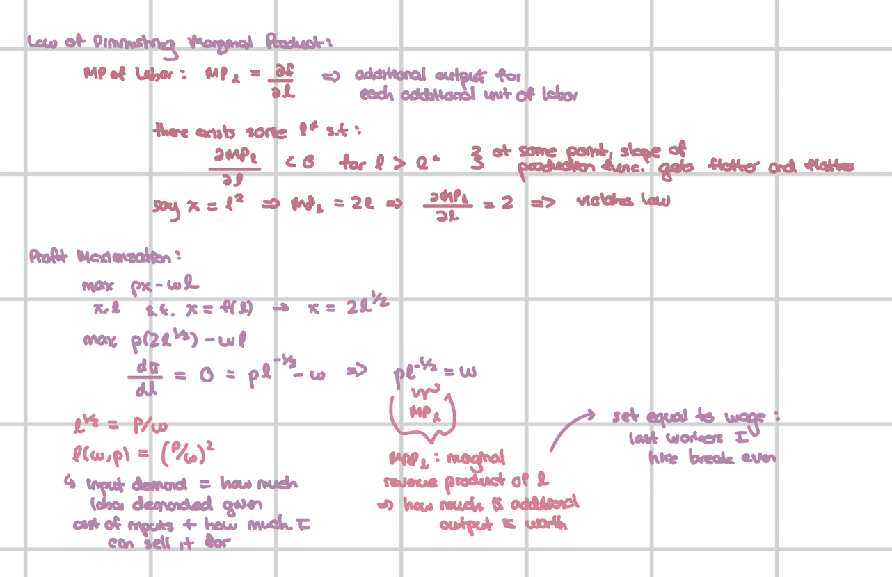 MPl = df / dl → dMPl / dl < 0 → each additional worker adds less extra output (production function becomes flatter)
