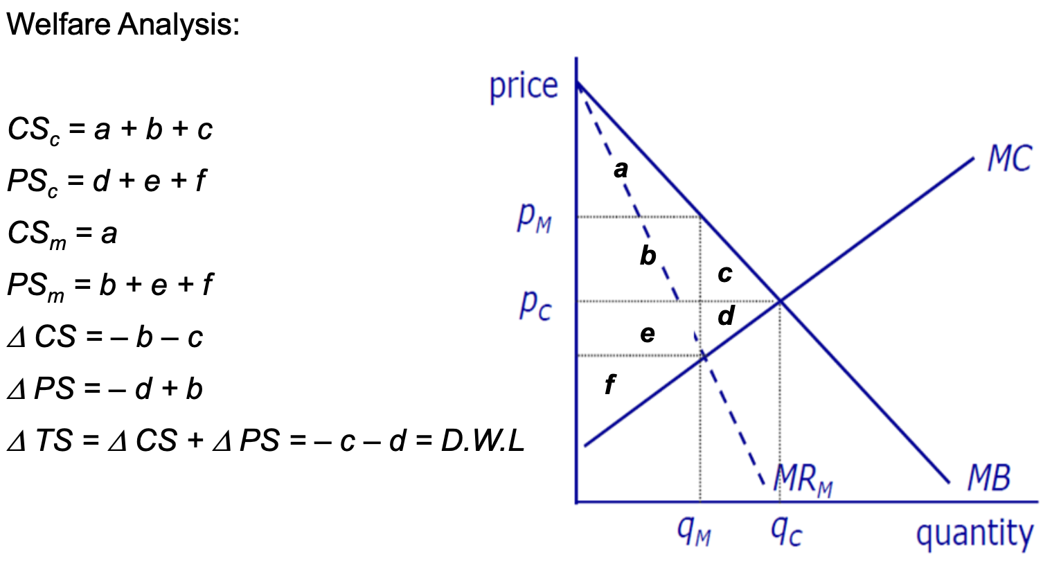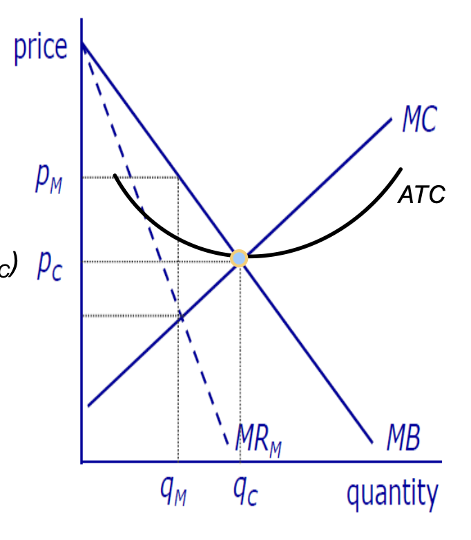 monopolist charges higher p (pm) and produces smaller qty (qm) compared to competitive indus (pc,qc)