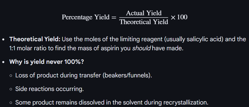 Percentage yield formulea// the ratio between salicylic acid and aspirin// why yield not 100%?
