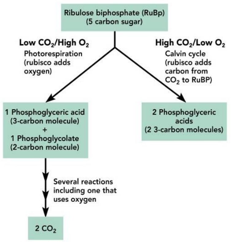 Rubisco and O2 under conditions of CO2 limitations initiates ____________ which breaks down sugars into ____