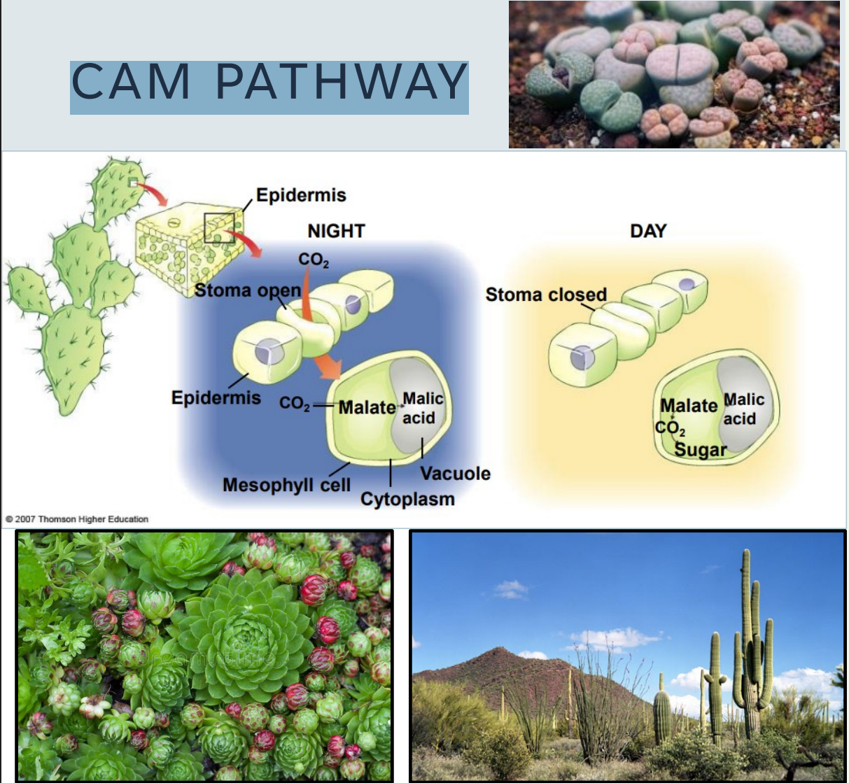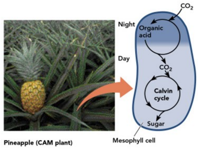 Organic compounds made are “stored” at night in their vacuoles when the stomata are open then used later during the day.