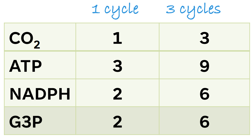 For every 1 CO2 (1C)fixed → 2 G3P (3C) formed