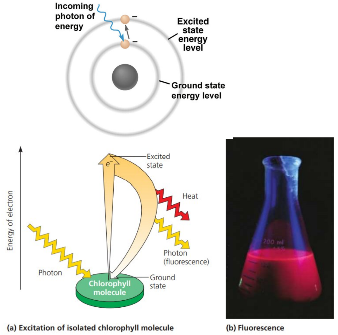 If the illuminated molecule is isolated, its excited electron immediately returns to ground state, releasing _______ and ______________