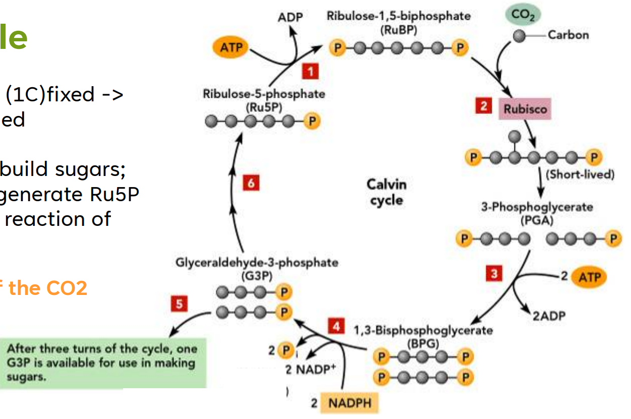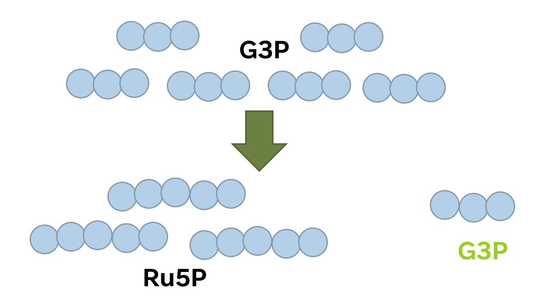It is used to build sugars; also used to regenerate Ru5P (5C) in the first reaction of the cycle