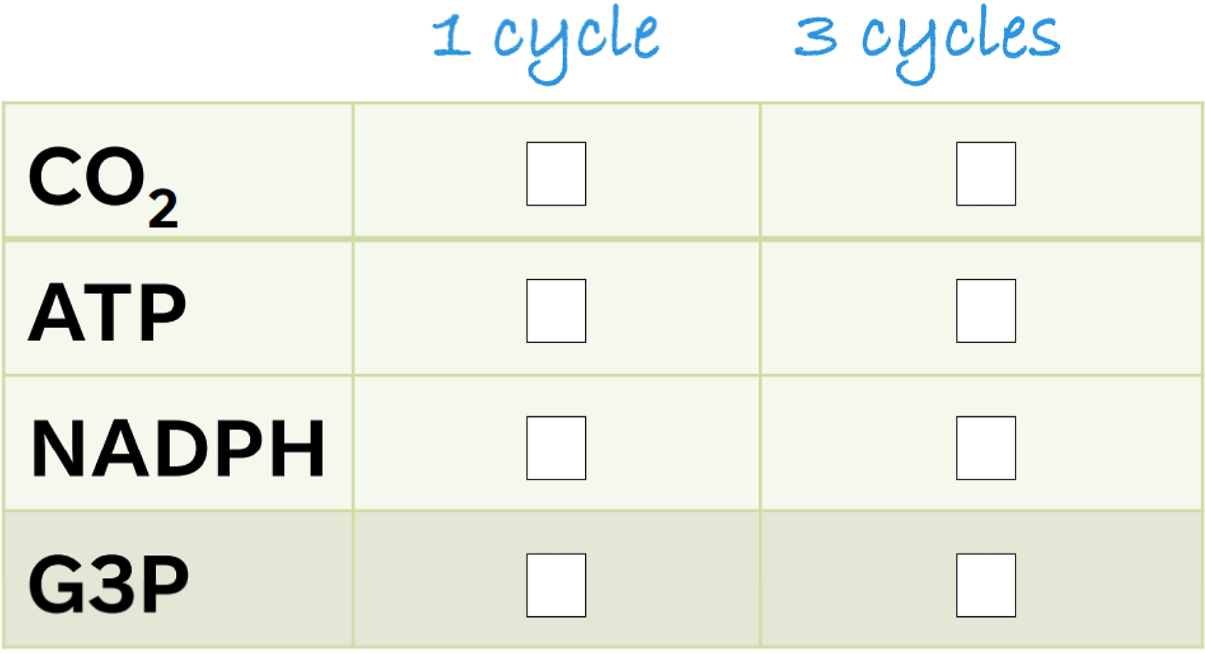 For net synthesis of 1 G3P, the cycle must take place ______ times, fixing _ molecules of CO2