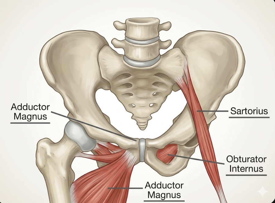 Hip Adduction (The Broad Job): The entire muscle is built for this. With its origins spanning along the bottom of the pelvis, any contraction will pull the thigh inward toward the center line.