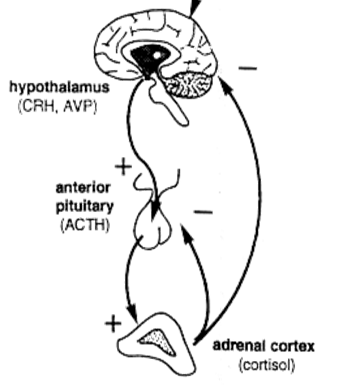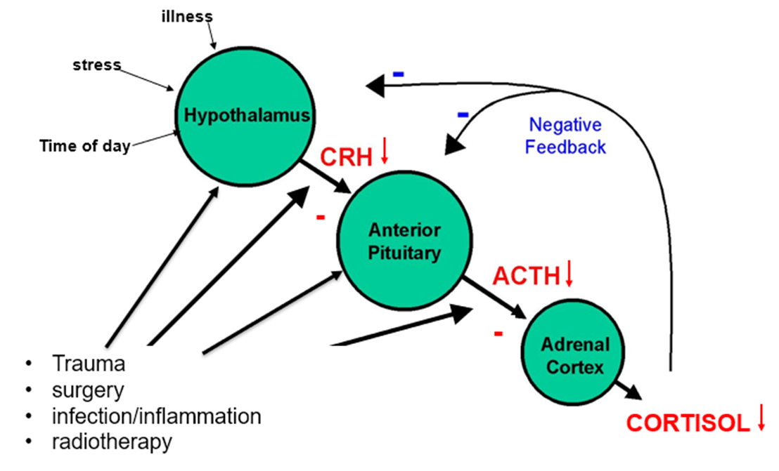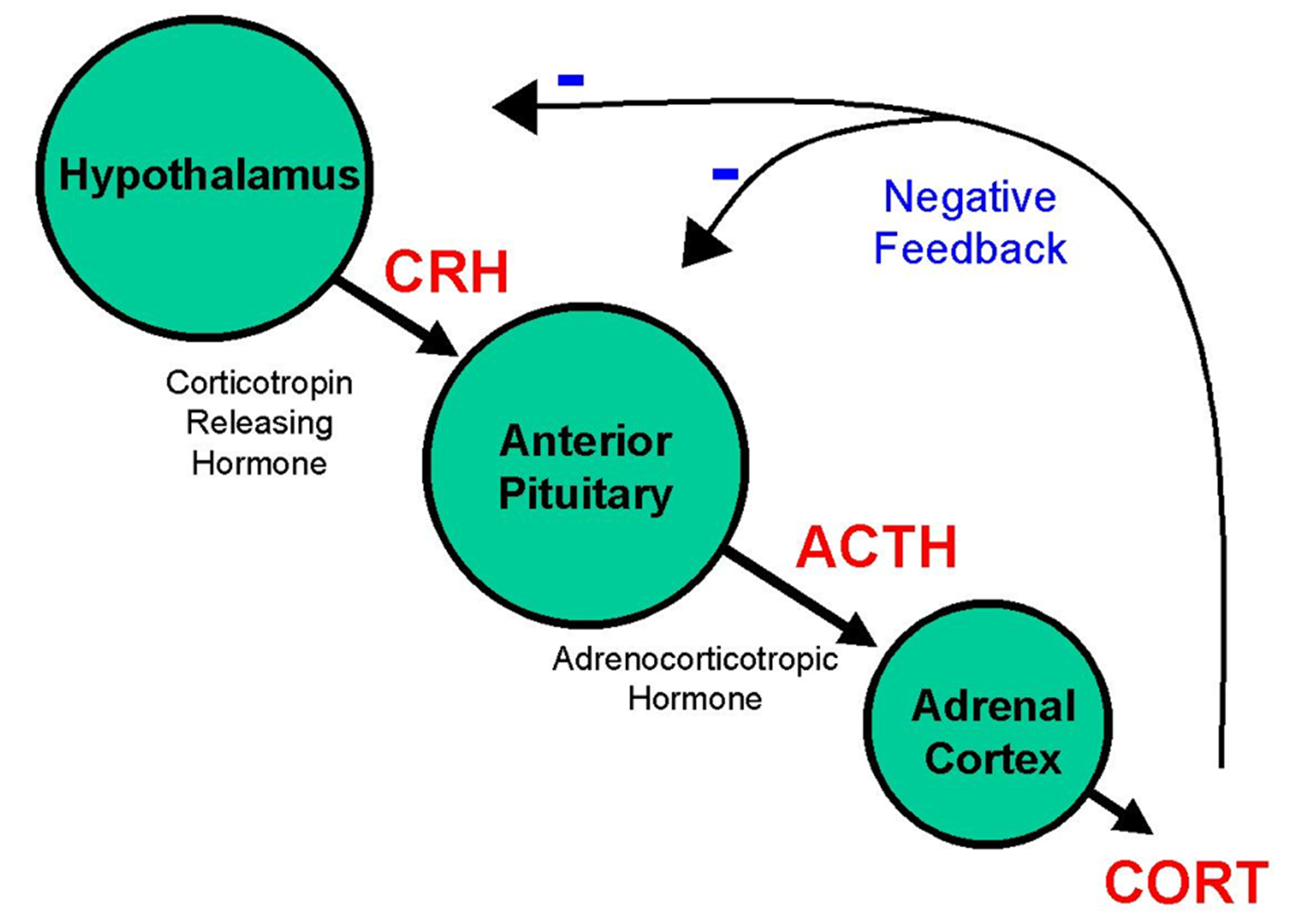 CRH (hypothalamus) → ACTH (pituitary) → cortisol (adrenal). ↑ cortisol feeds back negatively on both CRH and ACTH, creating a diurnal rhythm (peak early‑morning, lowest at midnight).