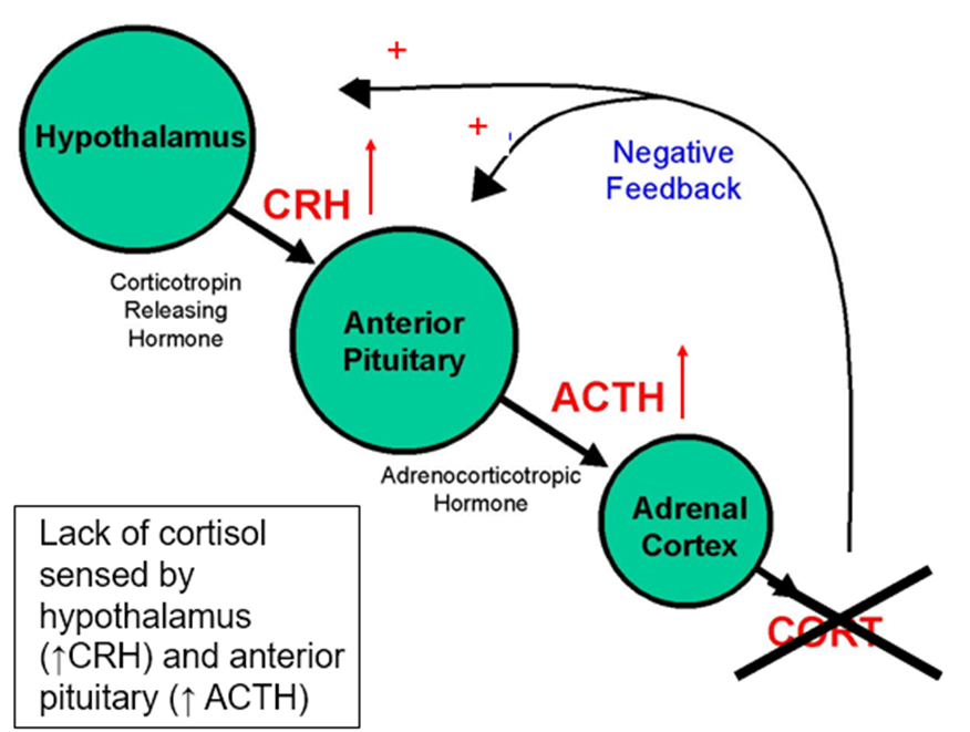 Loss of cortisol removes negative feedback → CRH ↑ → ACTH ↑↑.