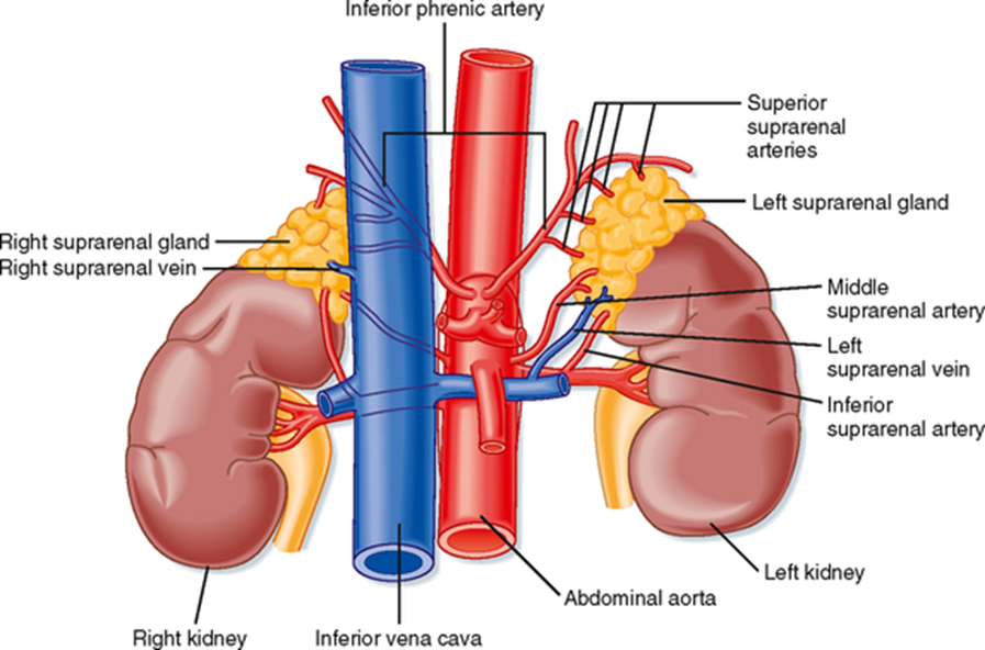 Superior, middle, and inferior suprarenal arteries; centripetal blood flow from capsule to medulla.