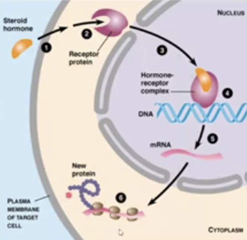 Steroid crosses membrane → binds receptor → receptor‑ligand complex enters nucleus → binds DNA → stimulates transcription → new proteins mediate effects.