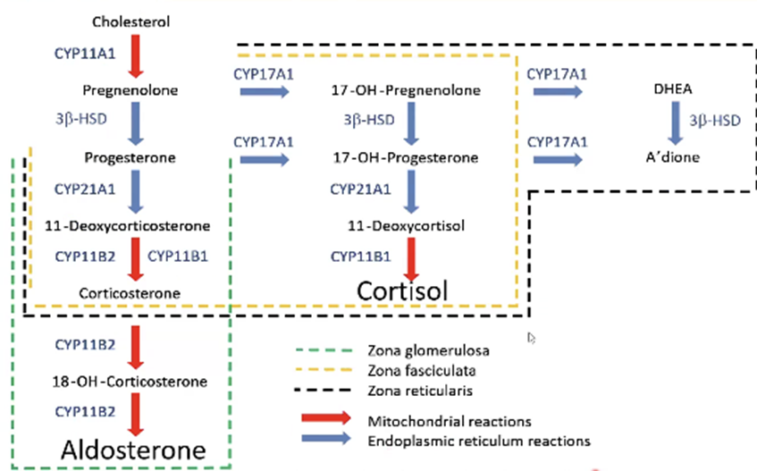 Mutations in CYP11B1, CYP17A1, CYP21A2 → congenital adrenal hyperplasia.