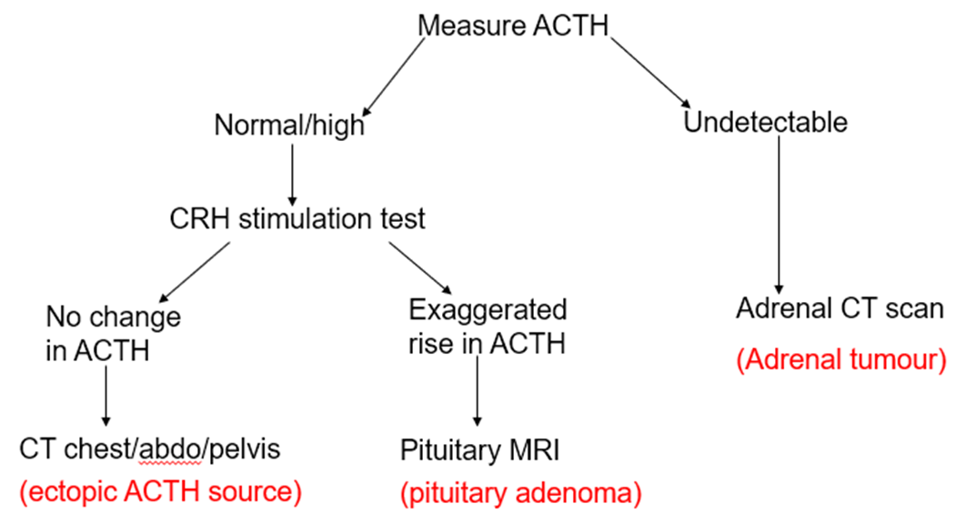 ACTH‑high → pituitary MRI (Cushing’s disease) or CT chest/abdomen for ectopic source.