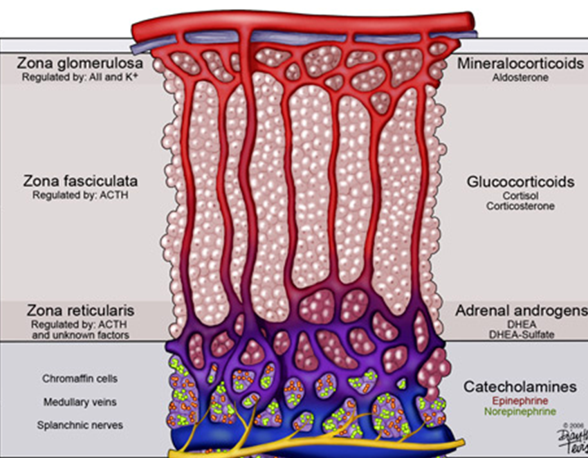 Outer cortex (steroid hormones) and inner medulla (catecholamines).