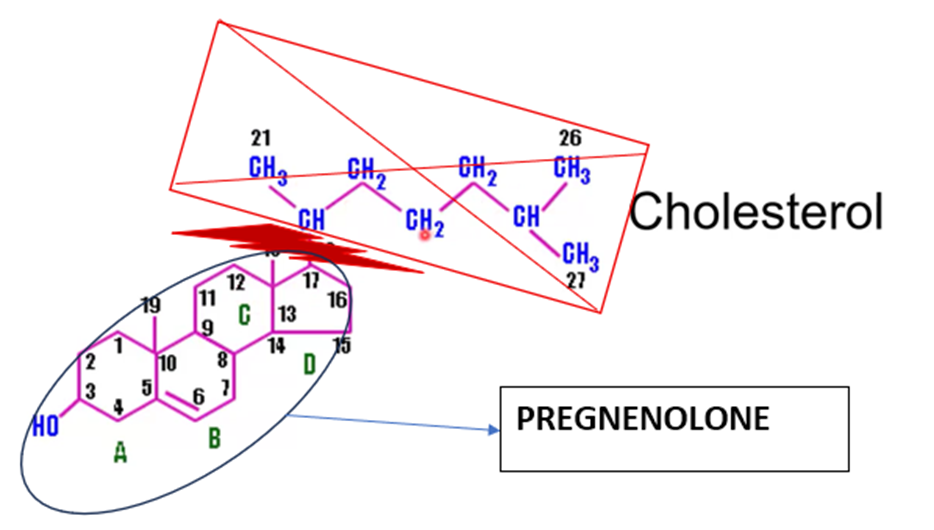 Cholesterol side‑chain cleavage → pregnenolone (enzyme: CYP11A1, mitochondrial P450).