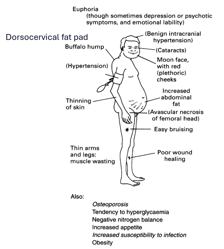 Musculoskeletal: proximal myopathy (Hips and shoulders), osteoporosis, pathologic fractures.