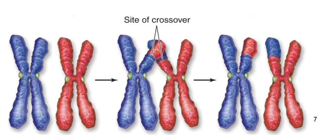 1) synapsis and cross-over, makes unique chromatids (recombine maternal and paternal genes)