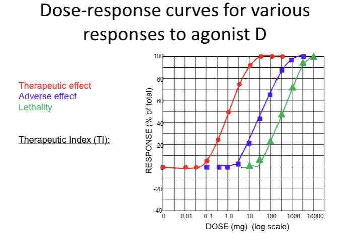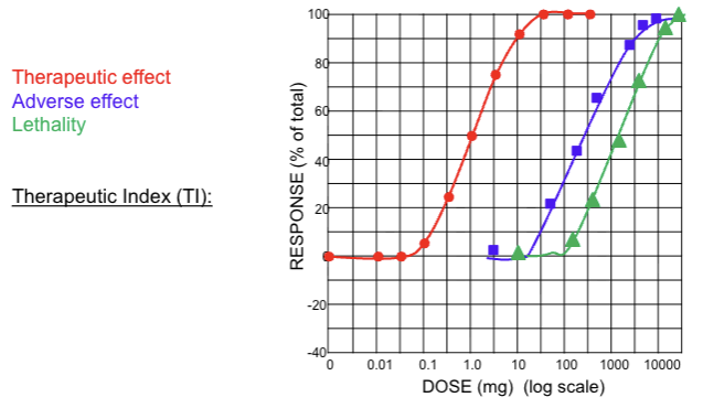 TI = ED50 (adverse effect) / ED50 (thera effect)