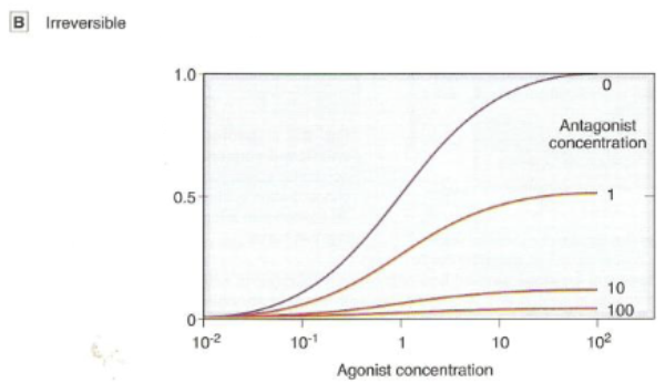 can’t overcome antagonist effects regardless of how much increase in agonist conc.